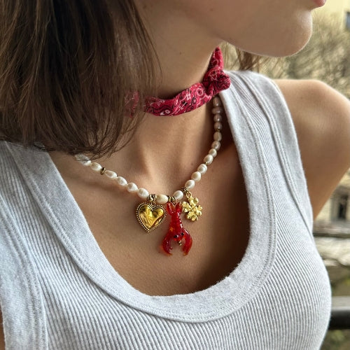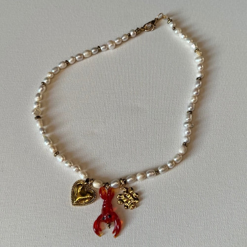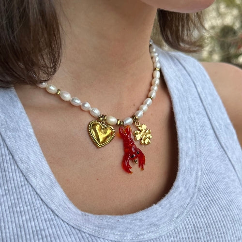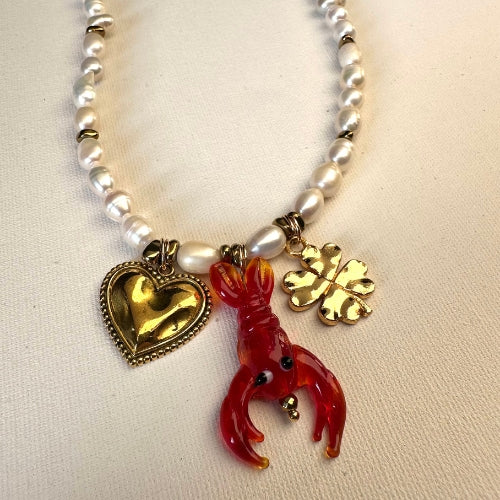 Colar | Pérolas, Hematitas & Pingentes Lagosta, Trevo e Coração